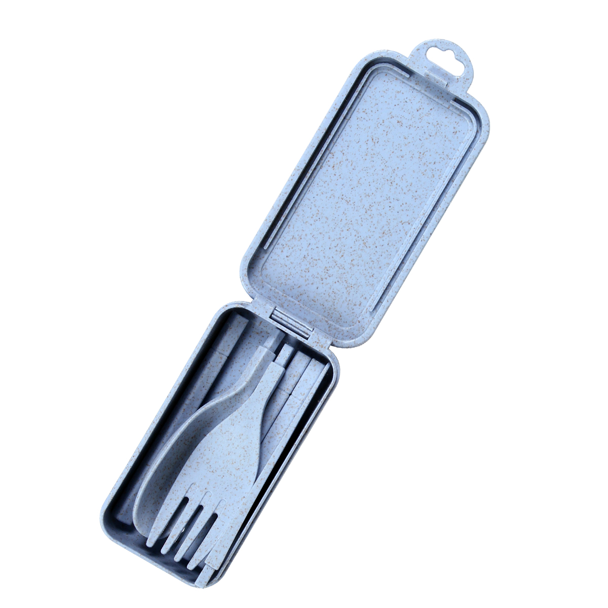 Set de cubiertos desarmables fabricados en fibra de trigo y polipropileno, contiene cuchara, tenedor, cuchillo y estuche del mismo material. Incluye caja de cartón individual. Son ideales para viajar y responsables con el medio ambiente.