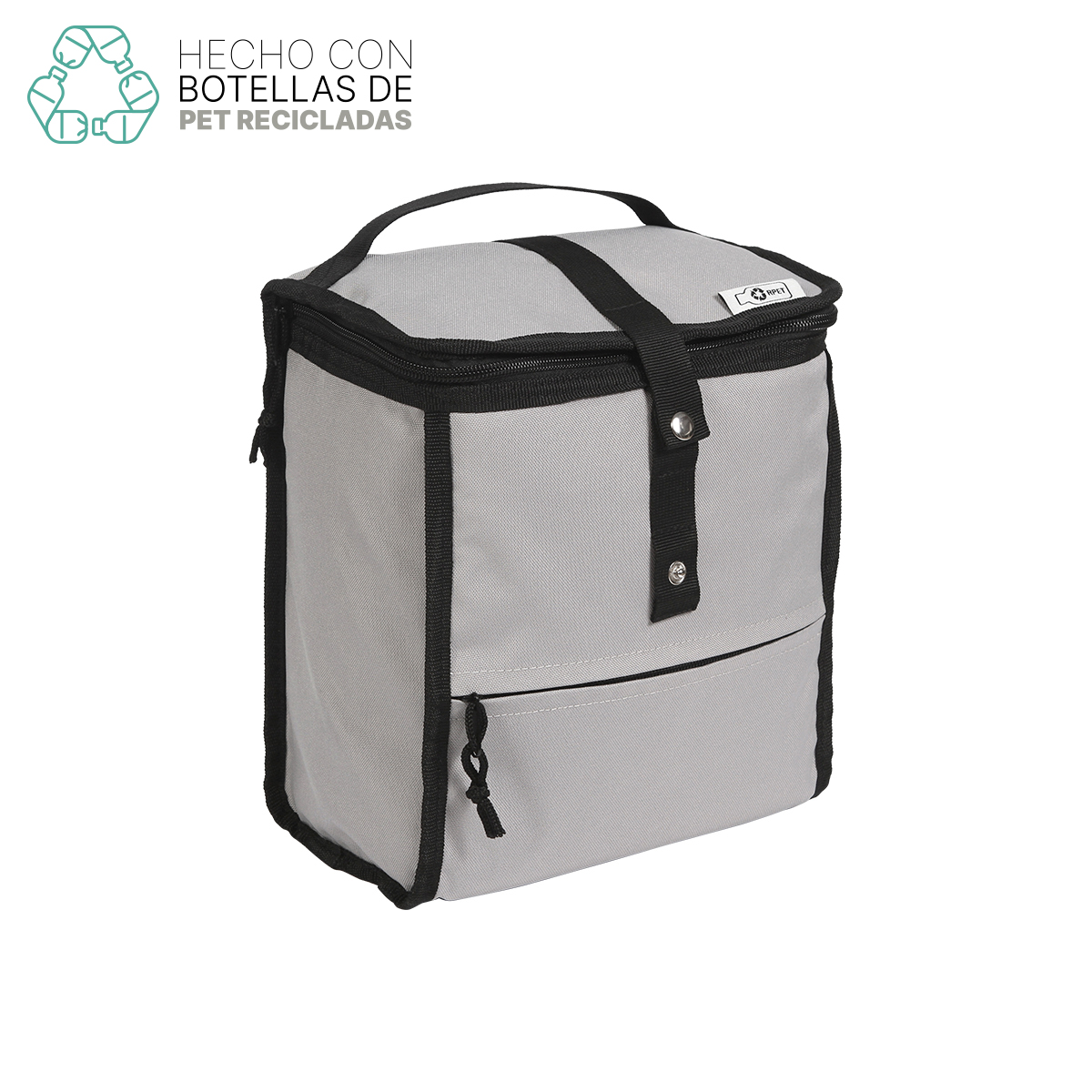 Lonchera térmica fabricada en poliéster reciclado (RPET), con 2 formas de cerrar, bolsillo frontal con cierre y asa superior. Esta bolsa es ideal para mantener tus alimentos frescos y en buen estado.  El RPET es un material resistente y duradero que puede soportar el uso diario y el desgaste, lo que lo hace ideal para productos textiles. Además es sostenible porque utilizan materiales reciclados en su fabricación, lo que reduce la cantidad de residuos y disminuye el impacto ambiental.